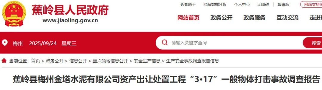 近日,广东梅州蕉岭县应急管理局发布蕉岭县梅州金塔水泥有限公司资产出让处置工程“3·17”一般物体打击事故调查报告。
